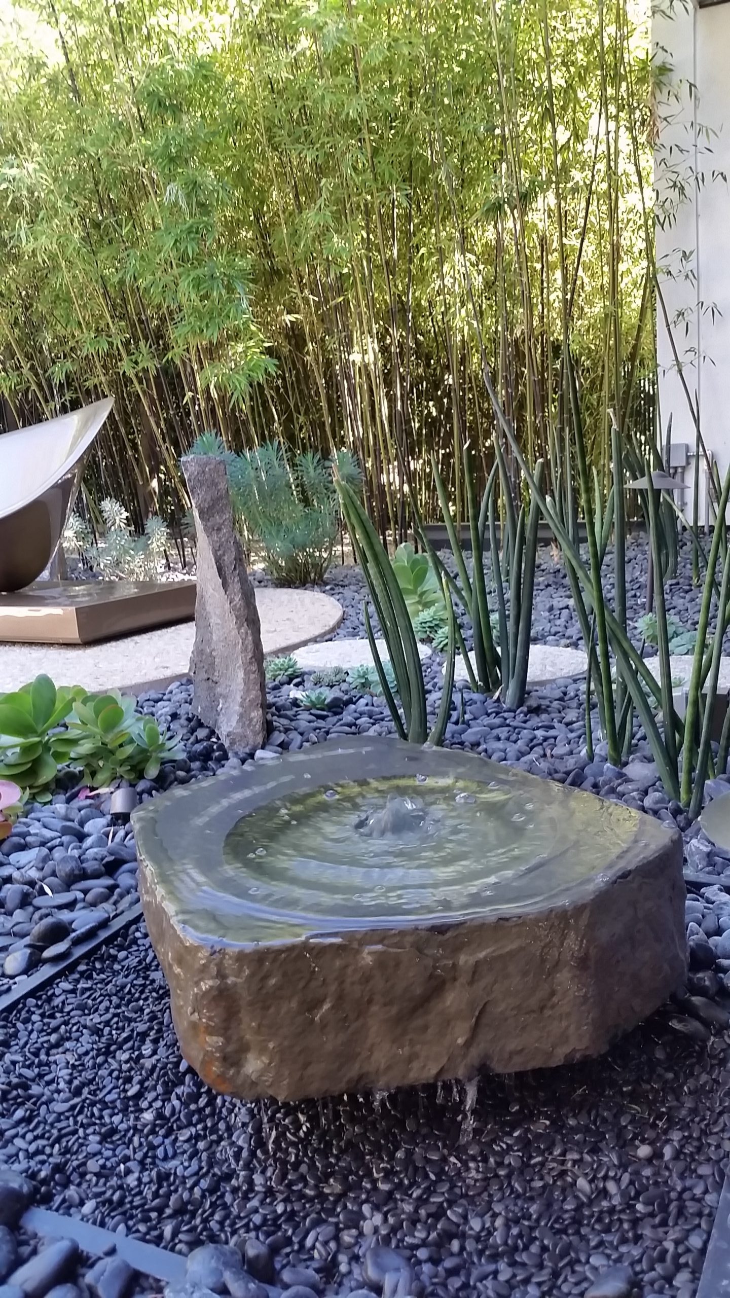 In the next two images, first, you will see a Bel-Air Koi Pond Remodel followed by a Bel-Air Fountain Maintenance example. The first features a crystal-clear pond with minimal algae on the walls and water lily pads. Next is a polished stone fountain surrounded by Mexican river rock of various sizes, lush bamboo trees that line the landscape, and garden ornaments such as a decorative stone and a sculpture.