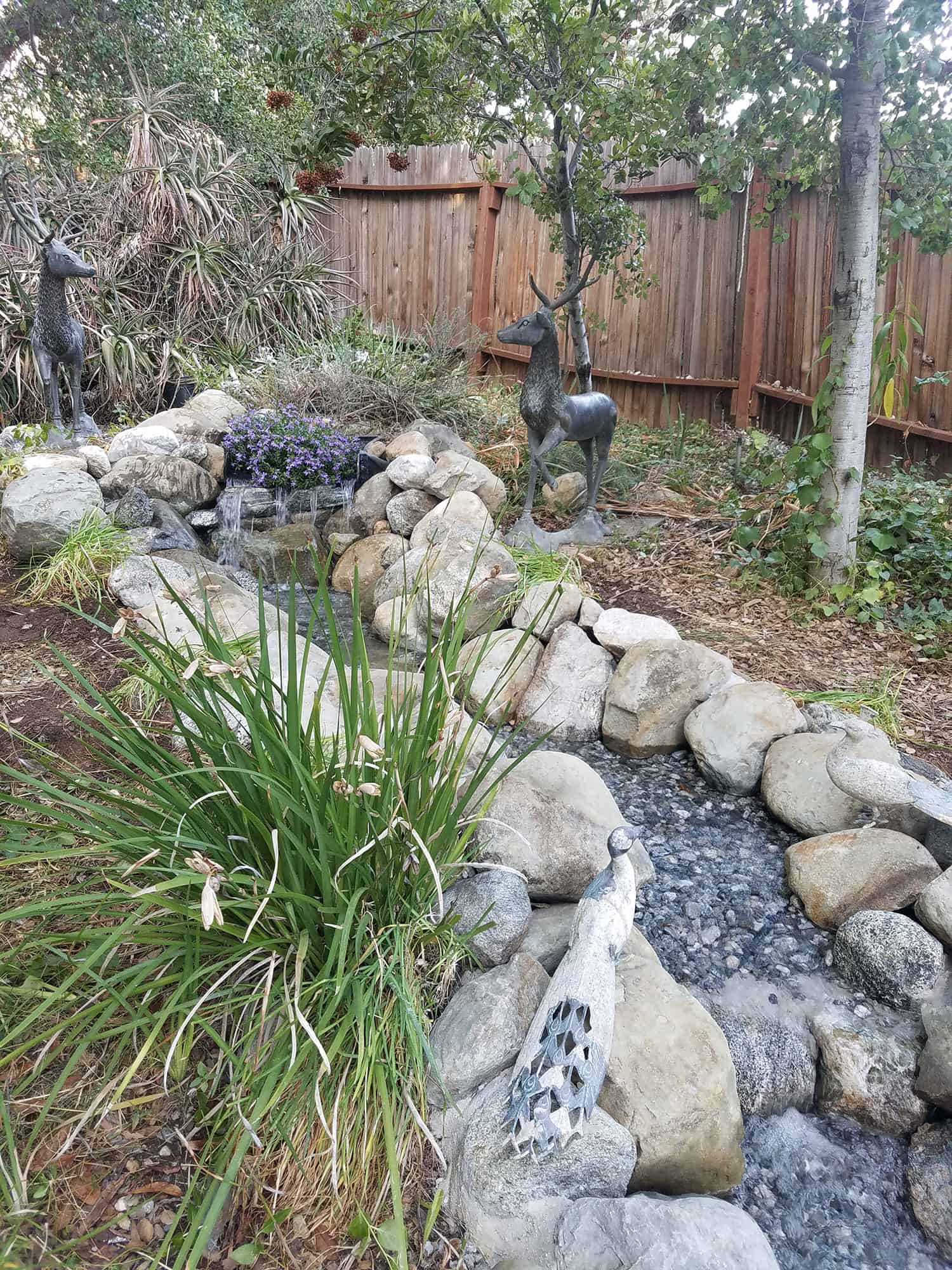 In the picture that follows, notice the beautiful streambed and waterfalls created by us. This Malibu pond was leaking profusely; therefore, all rockwork and coping were removed, properly waterproofed (20 yr warranty), and new coping, waterfalls, and streambed were put in place.